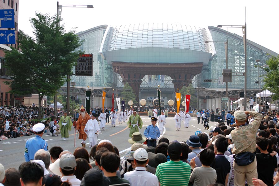 | 首先,先为各位介绍什么叫「百万石」:加贺藩主・前田利家在西元1583年6月14日进驻加贺藩后(以金泽为中心的附近区域),把加贺藩建造成一个丰衣足食的城市,所以加贺藩也称为「百万石」(以现在的计算1石等於150的米),在当时是日本最繁荣的城市之一。 藩主前田 利家为了庆祝加贺藩的建造及繁华,於是在隔年的6月14日开始每年都举办「百万石祭典」,到现在已有四百多年的历史。每当6月大家都很期盼。后来,改为6月的第一个星期六。 首先是160人的太鼓队为这盛大的祭典做序幕,令人情绪振奋!再由100人的团体表演民俗舞蹈「加賀音頭」,真是精彩!接下来是各式各样的团体游行,然后才是百万石祭典的重头戏――「百万石行列」,重现了当时前田利家带着武士们进来金泽时的庄重威严,浩浩荡荡的古装队伍,决不输给电影场面,真是壮观!!今年的游行队伍总共有2500人。为了让观众百看不厌,每年还特地请不同的明星来办演前田 利家及妻子前田 松。今年能看到哪个明星?也变成大家的乐趣之一呢!另外,还有各式各样的表演,尤其是在几层楼梯高的竹梯上表演类似特技叫「加賀鳶」,令人屏息…!!到了傍晚武士游行队伍走入金泽城的一幕,还真令人感动。 晚上从6点30开始还有各种团体大约有10000人一起跳日本民俗舞,场面非常浩大。如果您还有精力的话,晚上一般不开放的兼六园及金泽城,是个不错的选择,其美景看过的话,永生难忘。 如果有机会的话,一定要来看哦,保证不虚此行。